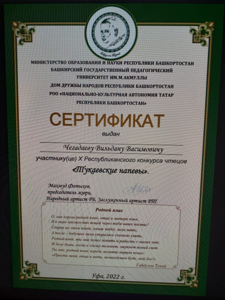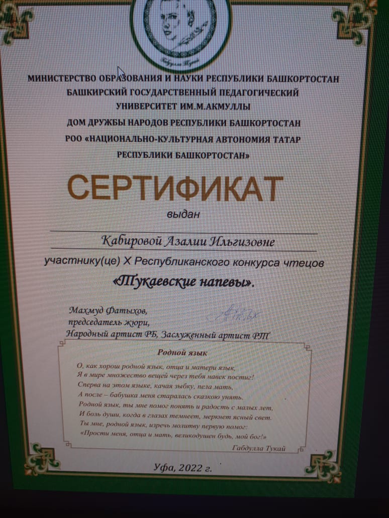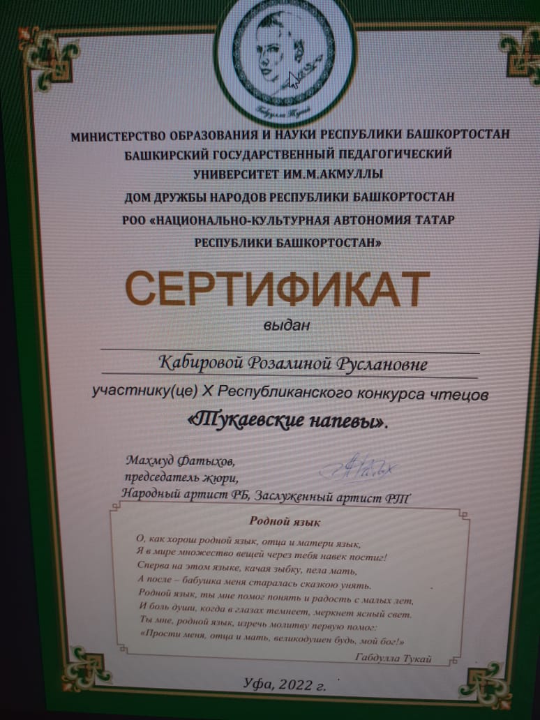 Обучающиеся школы приняли участие в Республиканском конкурсе чтецов "Тукаевские напевы" и получили сертификаты.