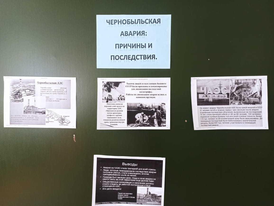 С 21 по 26 апреля во всех классах прошли классные часы на темы: "Чернобыль: экология, человек, здоровье", "Чернобыльская авария: причины и последствия".