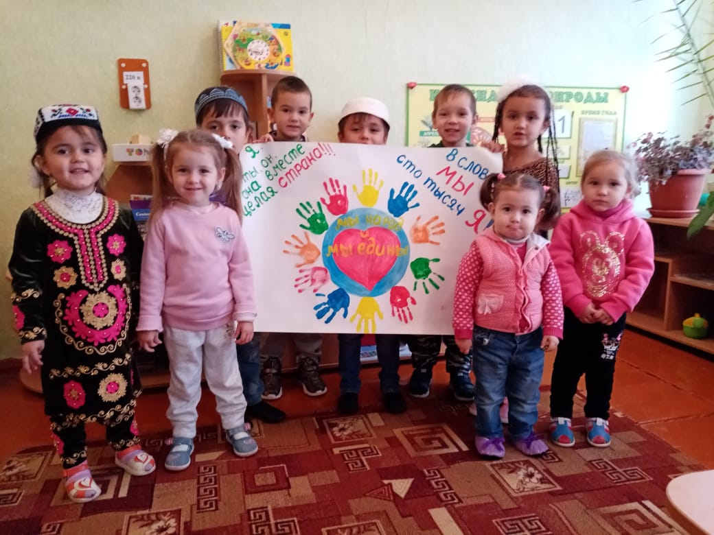 Сегодня в нашей группе прошёл праздник "Единство в наших сердцах". Ребята своими руками изготовили плакат, посвящённый этому мероприятию. Даже самые маленькие воспитанники нашей группы не остались в стороне от этого события, мало что понимая значение этого праздника.Все приложили свои маленькие ладошки рядом друг с другом на плакате, как будто крепко держась за руки.